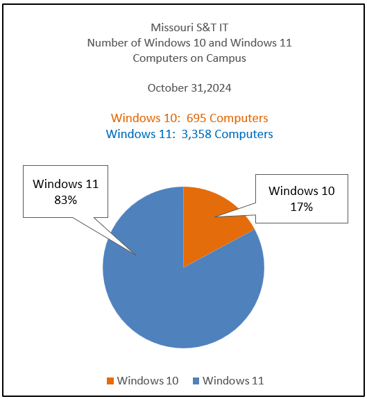 In 2023, S&T’s information technology team began focusing efforts on and communicating to employees about the transition to the Windows 11 operating system so campus computers comply with UM System Information Security policies and guidelines. In fall 2025, Microsoft will stop supporting the Windows 10 operating system.
