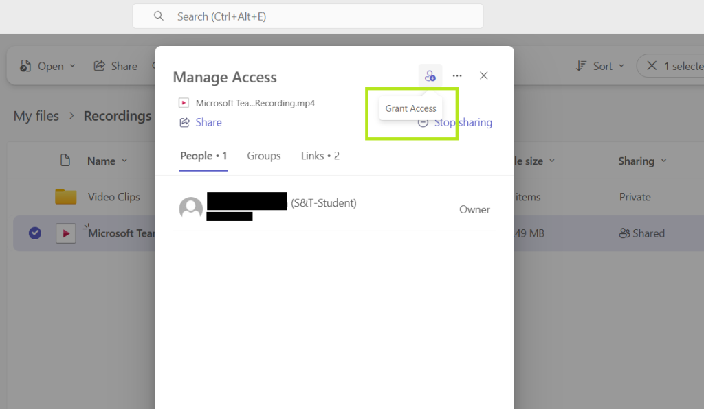 In order to share the recording to others, click on shared and on the pop up box you can choose Grant Access option to enable access.