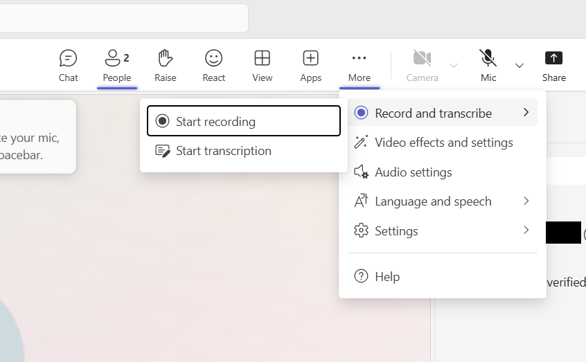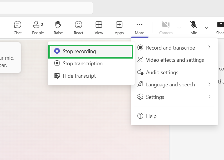 4. Stop the recording once after the meeting is completed. Stopping the recording is only accessible to the host. Click on Stop recording.