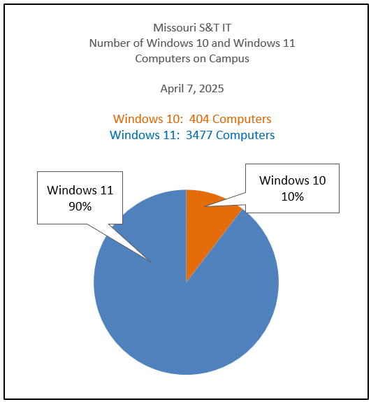 In 2023, S&T IT began focusing efforts and communicating to campus about the transition to Windows 11 operating system for campus computers to be compliant with UM System Information Security policies and guidelines. In fall 2025, Microsoft will no longer support the Windows 10 operating system. IT has a goal to transition computers running Windows 10 off our main network by the spring of 2025. Any campus managed computer running Windows 10 after April 10th will no longer allow logins.