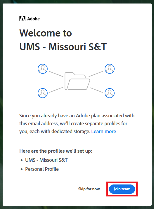 3. After signing in, Adobe display the notice below. Click “Join team” if it is presented.