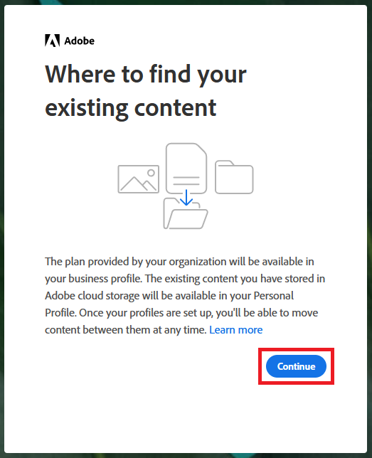 4. If you are then presented with a notice about your stored content, please carefully read it and click “Continue”. If you are affected by this change, please see our document on how to migrate your files: How to Transfer Files Across Adobe Accounts or Profiles